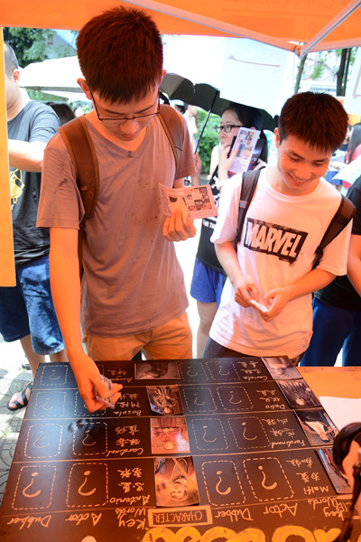 四大剧组分别设置了角色匹配、翻牌、丢硬币、选台词、拼海报等小游戏,现场同学通过参与这些游戏可以获得富有各剧组特色的小礼品和抽取门票的机会。第二剧组推出的“You Are the Only One Who Knows”游戏,让参与者在限定时间内记住剧中主要角色的特征,然后指出各个角色拥有的特定道具,这不仅使同学们感到耳目一新、新颖独特,也收到了不错的宣传效果。第一剧组的限量版纯手工制作书签,第四剧组的印有Antigone的特制水杯、明信片和书签都让同学们爱不释手。各摊位前人潮涌动,各剧组的工作人员在小游戏进行的同时,积极地向参与者介绍和宣传自己的剧组。在工作人员的热情解说下,同学们对各剧目的精彩内容有了进一步的了解。