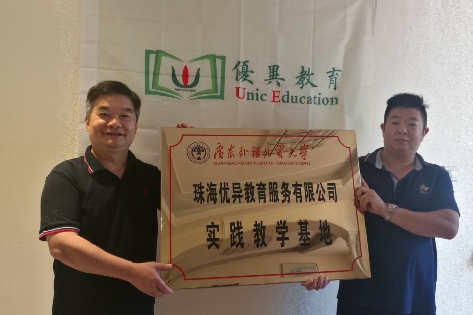 本网讯 7月22日,广东外语外贸大学英文学院与珠海优异教育有限公司共建实践教学基地挂牌仪式在珠海顺利举行。学院党委王斌书记,英语教学部主任王蕴峰博士、翻译系胡正茂博士,优异教育张廷忠总经理,胡碧辉执行校长等出席了仪式。