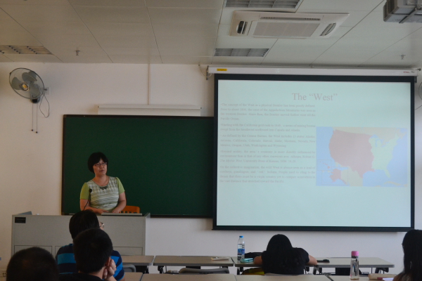 本网讯 9月26日下午2:30,《西部牛仔与镀金时代:神话和现实》讲座在七教523室举行,这是秋季英文学院“美国镀金时代通俗文化系列讲座”第二场讲座。本次讲座由杨静博士主讲,她的代表作有《美国电影塑造的中国女性形象:1990-2000》和《庭院里的女人》等。参加本次讲座的还有部分英文学院的研究生和老师。